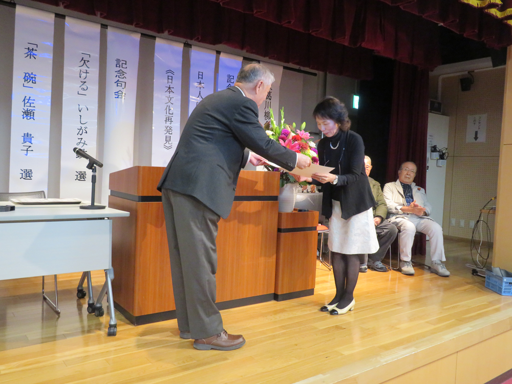 貴子さんは、関東の大会を荒らし回っており、タイトル賞を必ず手にされております。一見、東北弁に似た茨城弁で訥々と話されますが、いつもユーモアたっぷりです。私も今年初めて参加致しましたが、水戸川柳会の会長としての大会運営の素晴らしさを目のあたりに致しました。披講を聴いていて、だんだんと吸い込まれて行く感がありました。