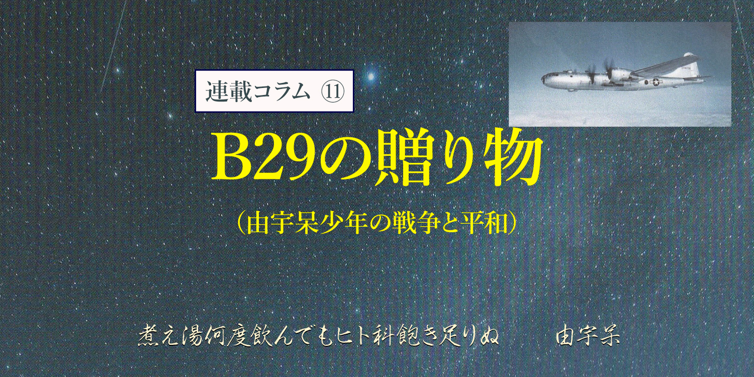 本稿は 東葛川柳会の『ぬかる道』誌(2005年9月~2007年9月)に24回にわたって連載された「由宇呆少年の戦争と平和」を抜粋し、若干の補筆を加えて2023年7月にUFO書房より発行された「B29の贈り物(由宇呆少年の戦争と平和)」を転載したものです。